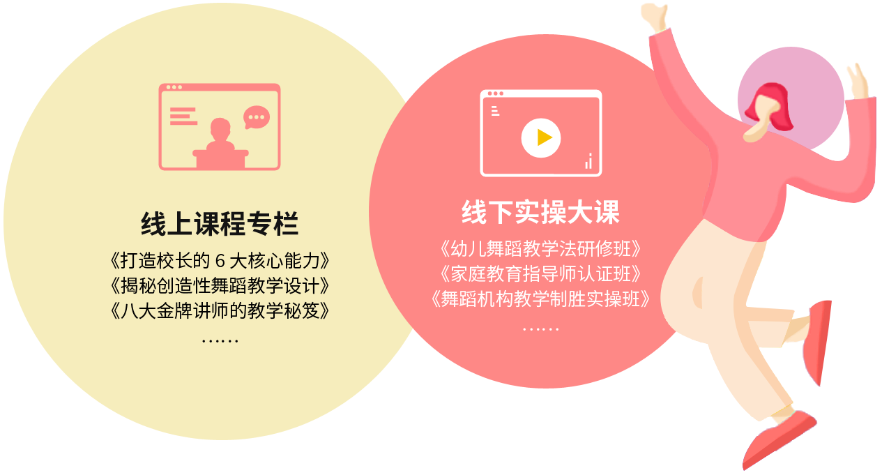 学院通过线上、线下的方式,提供舞蹈老师和舞蹈机构运营者成长所需的课程服务。帮助行业实现认知升级、能力跨越和业绩翻倍!