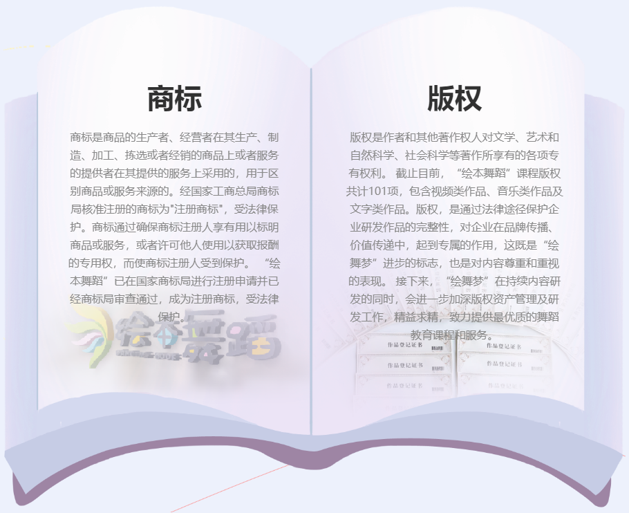 截止目前,“绘本舞蹈”课程版权共计101项,包含视频类作品、音乐类作品及文字类作品。版权,是通过法律途径保护企业研发作品的完整性,对企业在品牌传播、价值传递中,起到专属的作用,这既是“绘舞梦”进步的标志,也是对内容尊重和重视的表现。