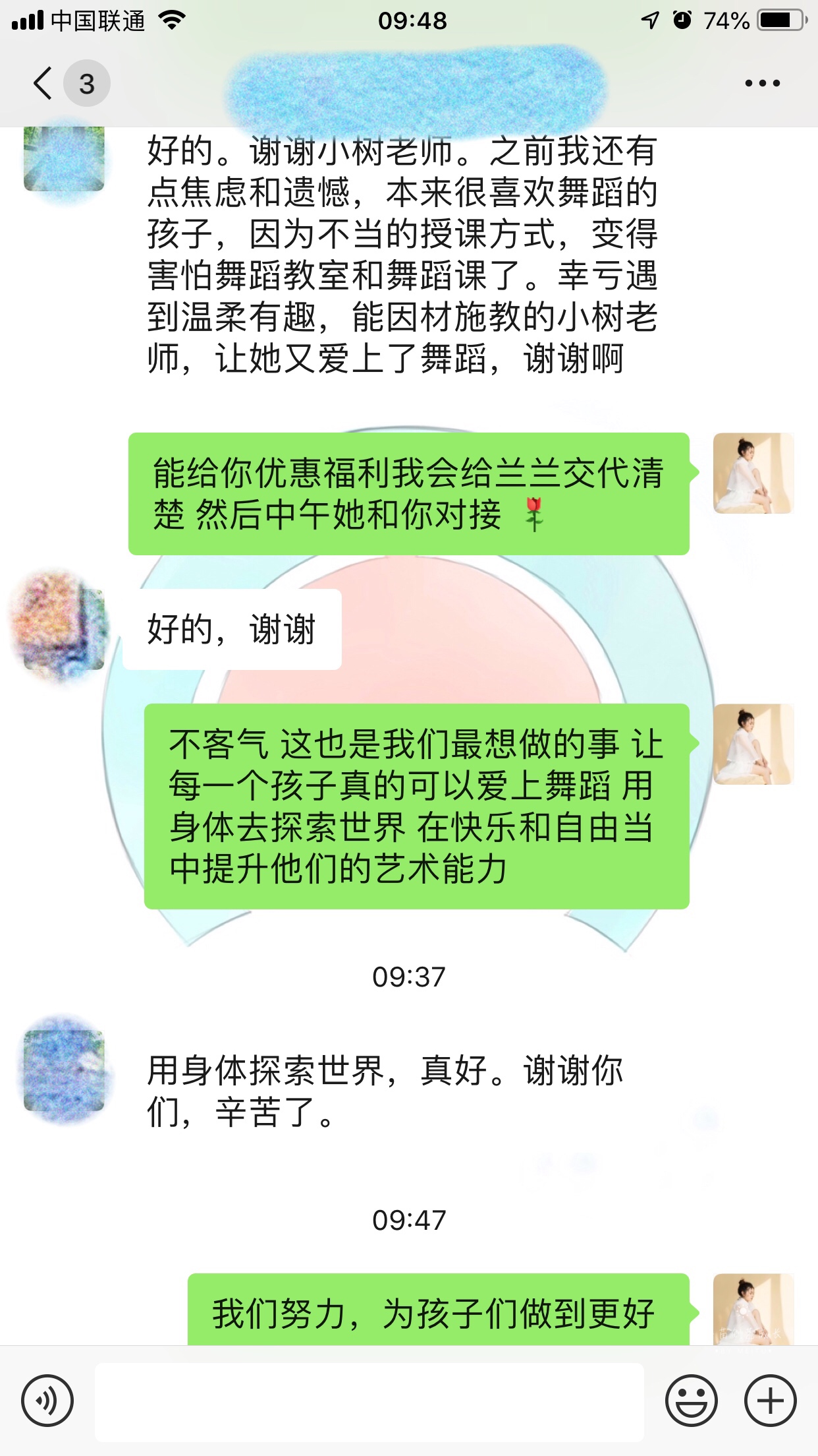 第一,小树老师对舞蹈发自内心的热爱和对孩子的用心,这份热诚让家长放心把孩子交给她,让孩子愿意跟着她学习