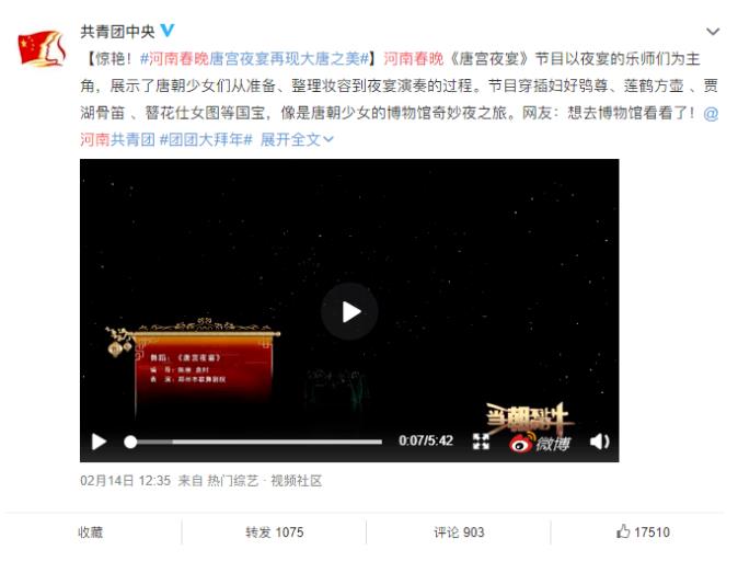 最近河南台春晚节目《唐宫夜宴》火了,网上播放量超千万,网友纷纷留言转发。连共青团中央和人民日报都转发盛赞,真的是彻底出圈了!