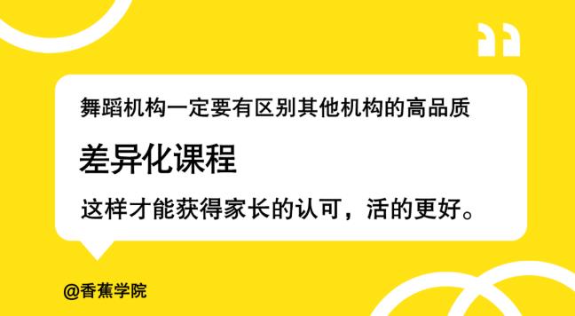 舞蹈机构要有高品质的区别于其他机构的创新课程。全国已经有几十万家的培训机构,现在每年还会出现很多。在这个过程中,舞蹈机构一定要找到自身存在的价值,自身的差异化。这样才能获得家长的认可,比其他机构活的更好。