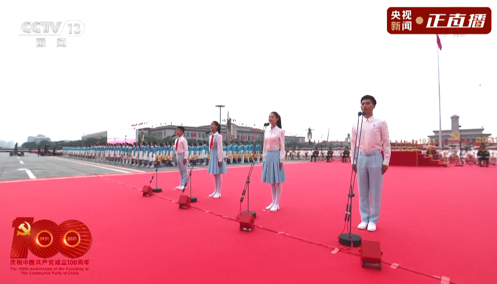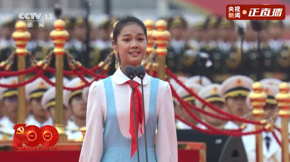 上午8点15分左右,一群穿着白衬衣、蓝下装的共青团员和少先队代表集体在天安门广场前献词,格外亮眼。四位领诵学生,可以说是全场焦点中的焦点。