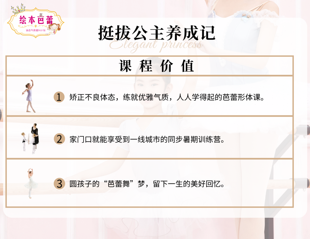 目前各地的绘本芭蕾合作机构已经开始暑期班的招生,不同于大街上的其他机构,特色的训练营——挺拔公主养成记,两个月还你一个挺拔的小公主!
