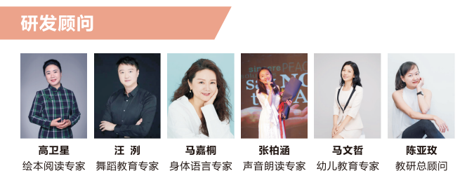 为了给孩子们更好的学习内容,绘本舞蹈组建了一支超强研发团队,不仅有舞蹈专家,幼教专家,还有绘本阅读专家,声音表演艺术家,音乐家等。